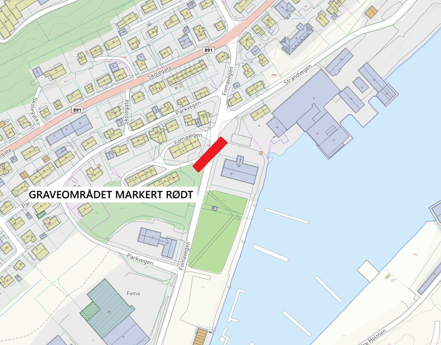 Årsaken er kryssing av gaten med nye avløpsledninger ifbm etablering av den nye pumpestasjon på Foma. Av hensyn til sikkerhet og framkommelighet er det nødvendig å stenge veien for kjøretøy i perioden.
