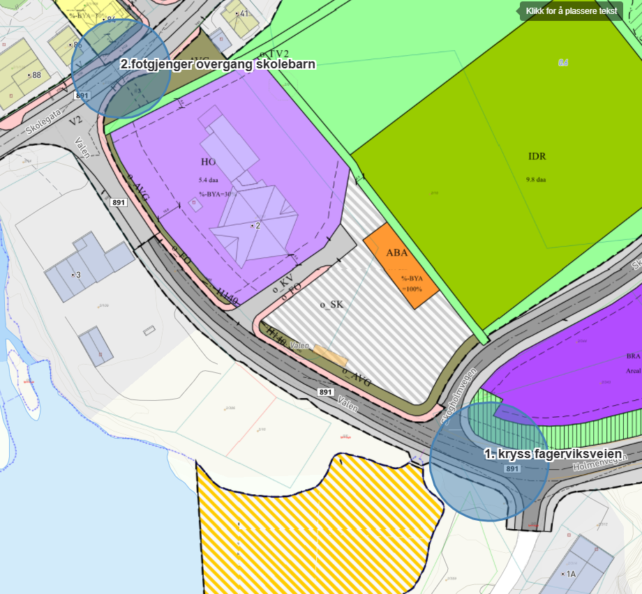Båtsfjord kommune har sendt en anmodning om 30 km/t fartsgrense for fotgjenger overganger som er merket med 1 og 2 i tegning. Det er blit skiltet med fotgjenger overgang der det er merket 1 på kartutsnittet. Forhåpenligvis blir det i år også satt opp skilt ved fotgjenger overgang merket med 2 i kartutsnittet.